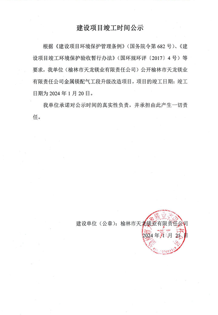 天龍鎂業(yè)金屬鎂2.25萬噸、蘭炭50萬噸驗(yàn)收公示